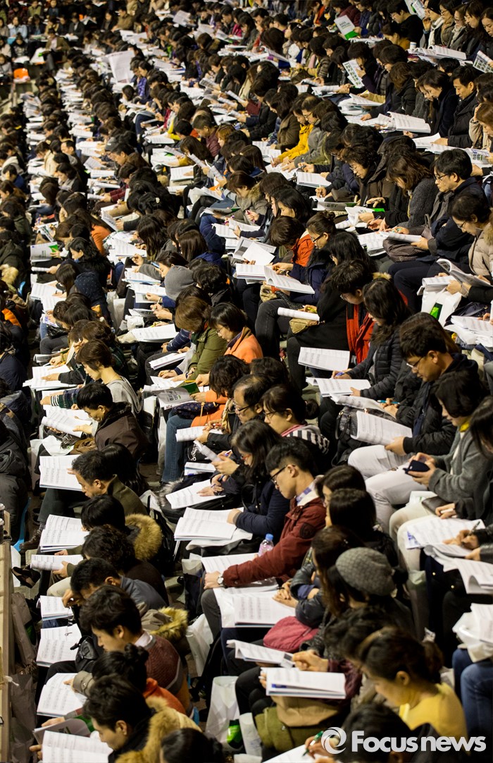 (서울=포커스뉴스) 12일 오후 서울 성동구 한양대학교 올림픽체육관에서 열린 '2017학년도 대학입시설명회'에 참석한 학부형, 수험생 및 관계자들이 주요 대학 배치참고표를 보고 있다.