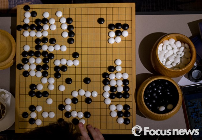 (서울=포커스뉴스) 이세돌 9단과 인공지능 알파고의 '구글 딥마인드 챌린지 매치' 3차 대국이 열린 12일 오후 서울 종로구 포시즌스 호텔 내 공개해설장에서 한 관계자가 대국을 따라 돌을 놓고 있다.