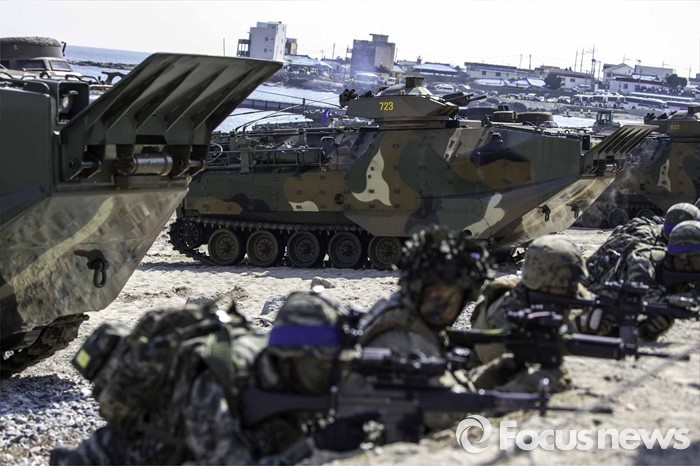 (포항=포커스뉴스) 12일 오후 경북 포항시 일대 해안에서 한미해병대의 연합상륙작전이 실시되었다. 해안가로 돌진하고 있는 상륙돌격장차들에서 일제히 연막을 전개하고 있다.
