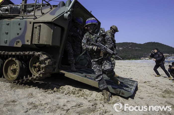 (포항=포커스뉴스) 12일 오후 경북 포항시 일대 해안에서 한미해병대의 연합상륙작전이 실시되었다. 해안가로 돌진하고 있는 상륙돌격장차들에서 일제히 연막을 전개하고 있다.