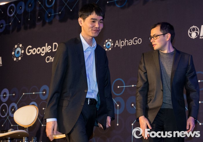 (서울=포커스뉴스) 12일 오후 서울 종로구 포시즌스호텔에서 열린 구글 딥마인드 챌린지 매치 제3국 기자회견에 참석한 이세돌) 9단(왼쪽), 데미스 하사비스 구글 딥마인드 대표가 무대를 내려가고 있다.