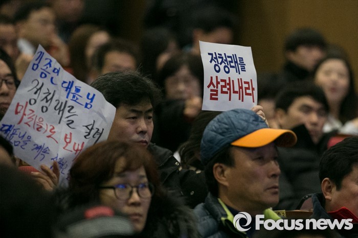 (서울=포커스뉴스) 정청래 더불어민주당 의원 지지자들이 13일 오후 서울 여의도 국회 의원회관에서 열린 더불어경제콘서트에 참석해, 정 의원 공천 탈락에 대해 항의하는 손팻말을 들고 있다.
