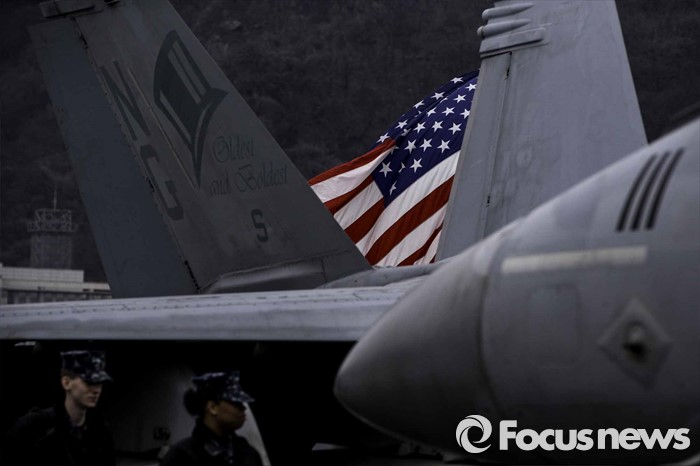 (부산=포커스뉴스) 13일 오후 부산 남구에 위치한 해군작전사령부에 입항한 존 C. 스테니스 핵항모가 취재진에게 공개되었다. 키리졸브 독수리 훈련에 참가하기 위해 한국을 찾은 스테니스항모는 길이 333m, 폭 78m,탑승 승조원은 6500명에 달하는 미 해군 핵심항모 중 하나다. 비행갑판 위에 대기하고 있는 F/A-18 호넷 전투기 뒷날개 사이로 성조기가 보인다.