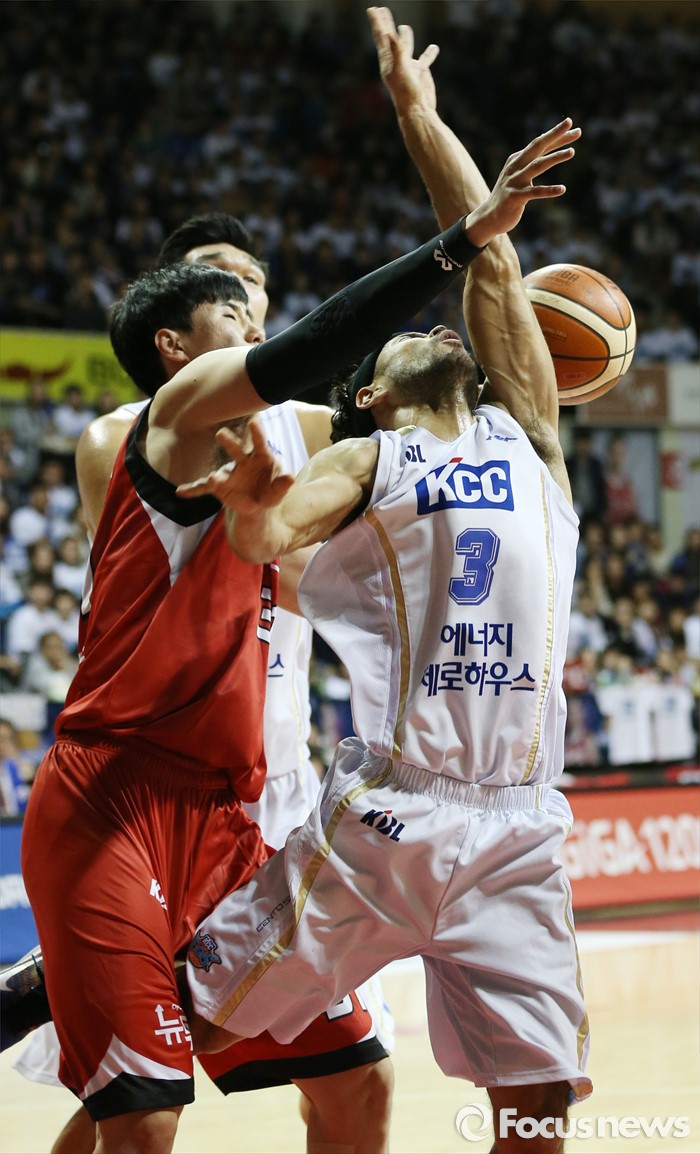 (안양=포커스뉴스) 13일 안양실내체육관에서 열린 2015-2016 프로농구 KGC-KCC 4강플레이오프 4차전에서 KCC 전태풍의 슈팅을 KGC 김민욱이 저지하고 있다.