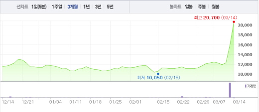 변경 후 최대주주는 더블유투자금융주식형투자조합제1호로 바뀌게 된다. 소유주식수는 45만867주(지분율 16.74%)다.주가흐름<사진출처=네이버 캡쳐>
