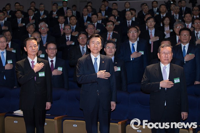 (서울=포커스뉴스) 14일 오전 서울 종로구 외교부에서 2016년도 재외공관장회의에 참석한 윤병세(앞줄 가운데) 외교부 장관이 김장수 주중국대사를 비롯한 재외공관장들과 국민의례를 하고 있다.