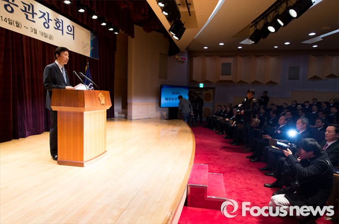 (서울=포커스뉴스) 14일 오전 서울 종로구 외교부에서 2016년도 재외공관장회의에 참석한 윤병세 외교부 장관이 인사말을 하고 있다.