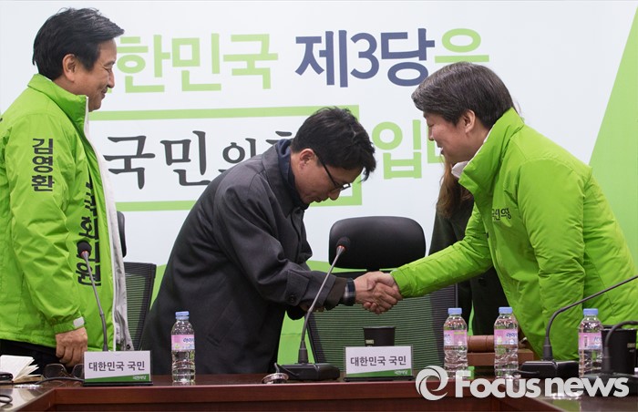 (서울=포커스뉴스) 안철수 국민의당 상임 공동대표(오른쪽)가 14일 오전 서울 여의도 국회 의원회관에서 공동대표와 상임선대위원장을 대신해 초청된 국민대표들과 인사를 나누고 있다.