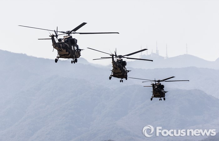 (영천=포커스뉴스) 10일 오후 제2작전사령부 예하부대에서 국산 헬기 수리온(KUH-1)이 육군항공·특공부대 전개훈련에 참가해 전술비행을 하고 있다.