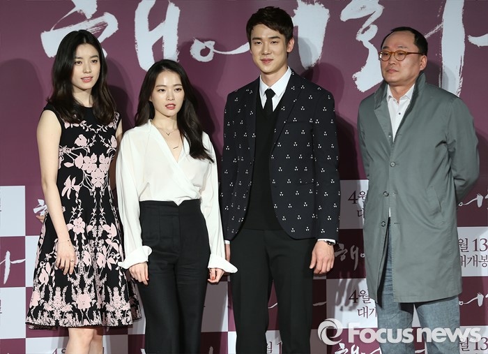 (서울=포커스뉴스) 14일 오전 서울 광진구 롯데시네마 건대입구점에서 열린 영화 '해어화' 제작보고회에 참석한 배우 한효주(왼쪽부터), 천우희, 유연석과 영화감독 박흥식이 포토타임을 갖고 있다.
