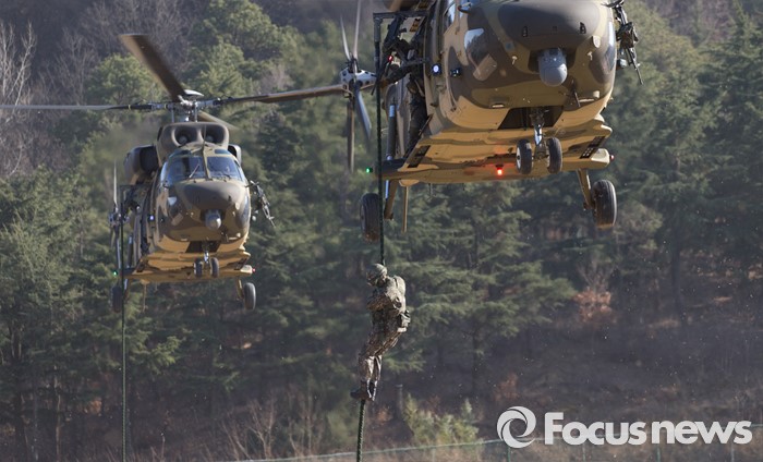(대구=포커스뉴스) 10일 오후 제2작전사령부 예하부대에서 육군항공·특공부대 전개훈련에 참가한 201특공여단 장병들이 국산 헬기 수리온(KUH-1)에서 패스트 로프를 이용해 작전지역에 침투하고 있다.