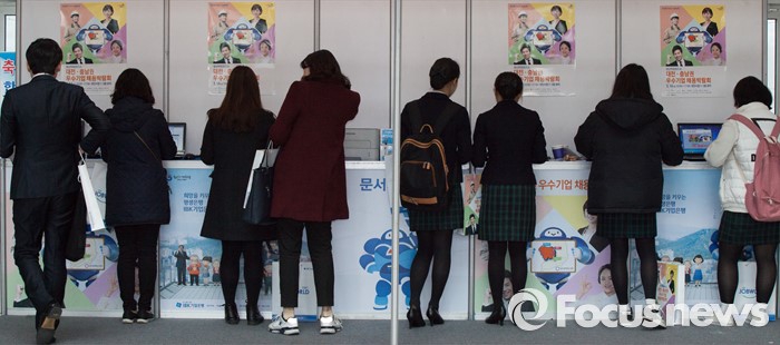 (대전=포커스뉴스) 14일 오전 대전시청에서 열린 청년희망로드쇼 대전·충남권 우수기업 채용박람회에서 구직자들이 이력서를 작성하고 있다.