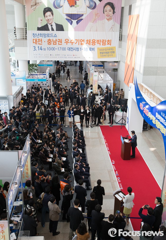 (대전=포커스뉴스) 황교안 국무총리가 14일 오전 대전시청에서 열린 청년희망로드쇼 대전·충남권 우수기업 채용박람회에 참석해 축사를 하고 있다.