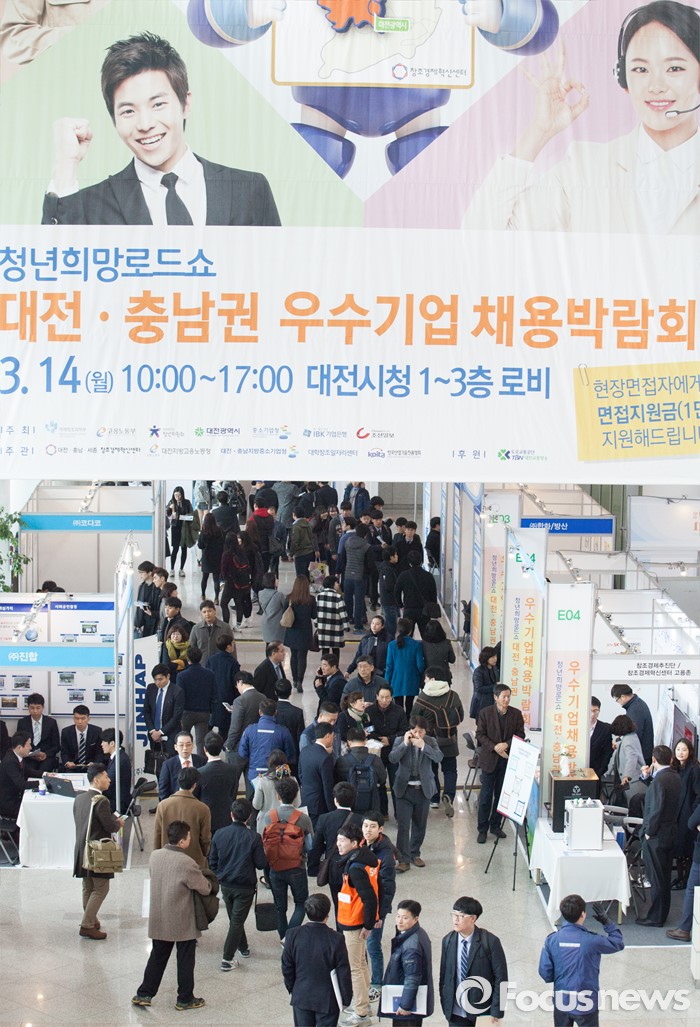 (대전=포커스뉴스) 14일 오전 대전시청에서 열린 청년희망로드쇼 대전·충남권 우수기업 채용박람회에서 많은 구직자들이 방문해 구직정보를 찾고 있다.