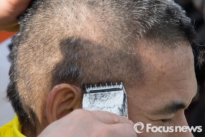 (서울=포커스뉴스) 14일 오후 서울 종로구 정부서울청사앞에서 전국교직원노동조합원 및 관계자들이 법외노조 판결에 대한 교육당국의 후속조치 철회를 촉구하며 삭발을 하고 있다.