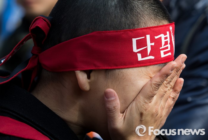 (서울=포커스뉴스) 14일 오후 서울 종로구 정부서울청사 앞에서 전국교직원노동조합 전임자들이 정부의 법외노조 후속조치와 부당탄압에 항의하며 삭발식을 하고 있다.
