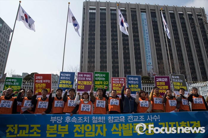 (서울=포커스뉴스) 14일 오후 서울 종로구 정부서울청사앞에서 전국교직원노동조합원 및 관계자들이 법외노조 판결에 대한 교육당국의 후속조치 철회를 촉구하며 구호를 외치고 있다.
