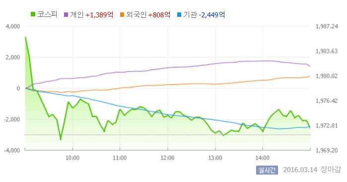 14일 코스피지수는 전거래일 대비 0.04%(0.86포인트) 오른 1972.27에 장을 마쳤다. 코스닥지수는 전거래일 보다 0.27%(1.88포인트) 상승한 691.05에 마감했다.