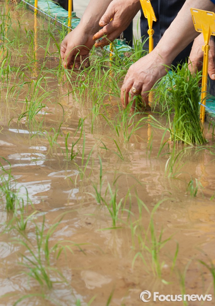 (청주=포커스뉴스) 14일 오후 충북 청주시 청원구 오창읍 충북농업기술원에서 열린 기능성 유색미 신품종 육성을 위한 첫 모내기 행사에서 박제국 충북행정부지사와 직원들이 모내기를 하고 있다.
