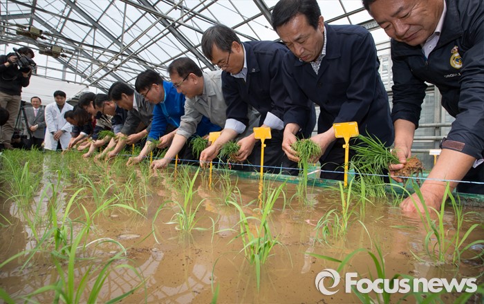 (청주=포커스뉴스) 14일 오후 충북 청주시 청원구 오창읍 충북농업기술원에서 열린 기능성 유색미 신품종 육성을 위한 첫 모내기 행사에서 박제국 충북행정부지사와 직원들이 모내기를 하고 있다.