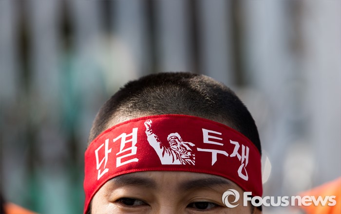 (서울=포커스뉴스) 14일 오후 서울 종로구 정부서울청사 앞에서 전국교직원노동조합 전임자들이 정부의 법외노조 후속조치와 부당탄압에 항의하며 삭발식을 하고 있다.