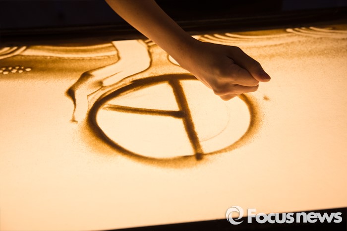 (서울=포커스뉴스) 14일 오후 서울 종로구 대한민국역사박물관에서 열린 대한민국 선거의 역사 '선거, 민주주의를 키우다.' 특별전시회 개막식에서 샌드 아티스트가 선거 도장 표시인 점 복자를 그리고 있다.
