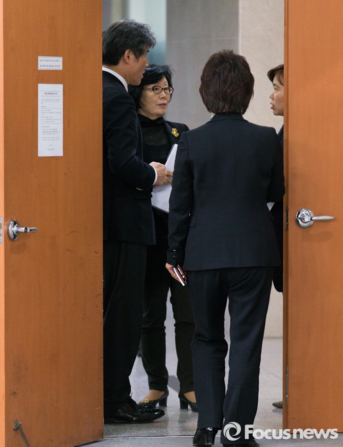 (서울=포커스뉴스) 신명(왼쪽 두번째) 더불어민주당 선거관리위원장과 관계자들이 14일 밤 서울 여의도 국회 정론관에서 20대 총선 후보 결정을 위한 1차 경선 결과 발표 전 대화를 나누고 있다.