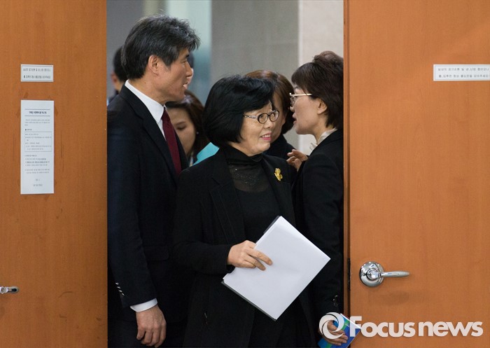 (서울=포커스뉴스) 신명(가운데) 더불어민주당 선거관리위원장과 관계자들이 14일 밤 서울 여의도 국회 정론관에서 20대 총선 후보 결정을 위한 1차 경선 결과 발표 전 대화를 나누고 있다.