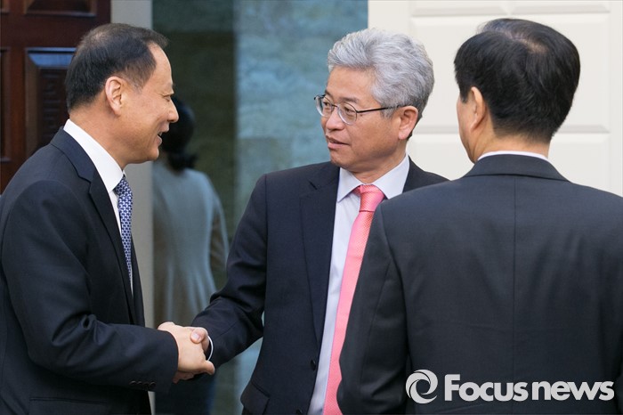 (서울=포커스뉴스) 이철우(가운데) 정보 정조위원장이 15일 오전 서울 여의도 국회 귀빈식당에서 열린 안보상황 점검 긴급 당정협의에 참석해,최종일(왼쪽) 국정원 3차장, 황인무 국방부 차관과악수하고 있다.