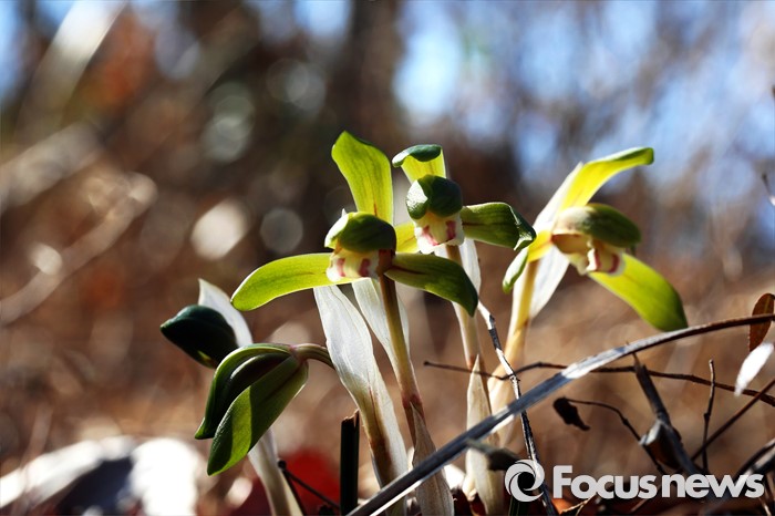 (완도=포커스뉴스) 꽃샘추위가 물러가고 봄기운이 다가온 15일 오전 전남 완도의 양지바른 야산에 자생하는 춘란이 꽃망울을 터트리고 있다. 꽃이 일찍 피기 때문에 보춘화라고도 하며,완도에서는 '꽁지발'이라고 부른다. <사진제공=이준택교수>