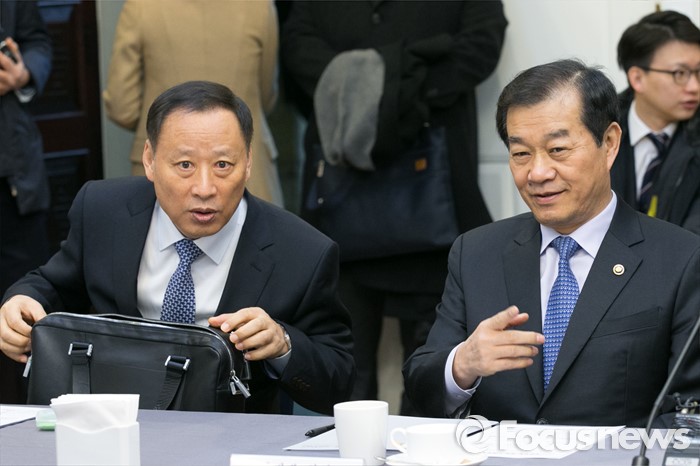 (서울=포커스뉴스) 황인무(오른쪽) 국방부 차관과 최종일 국정원 3차장이 15일 오전 서울 여의도 국회 귀빈식당에서 열린 안보상황 점검 긴급 당정협의에 참석해,대화하고고 있다.