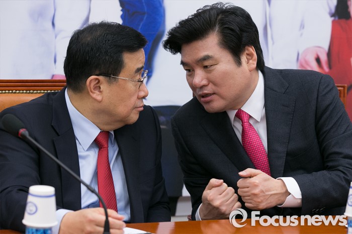 (서울=포커스뉴스) 원유철(오른쪽) 새누리당 원내대표와 김정훈 정책위의장이 15일 오전 서울 여의도 국회에서 열린 원내대책회의에 참석해, 대화하고 있다.