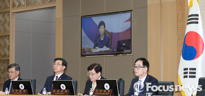 (세종=포커스뉴스) 15일 오전 세종시 정부세종청사 국무회의장에서 열린 청와대-세종청사 국무회의에서 국무위원들이 영상을 통해 박근혜 대통령의 모두발언을 경청하고 있다.