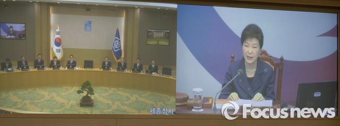 (세종=포커스뉴스) 15일 오전 세종시 정부세종청사 국무회의장에서 열린 청와대-세종청사 국무회의에서 국무위원들이 영상을 통해 박근혜 대통령의 모두발언을 경청하고 있다.