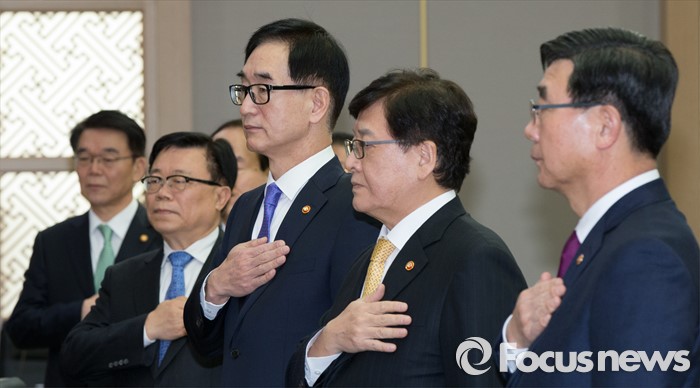 (세종=포커스뉴스) 15일 오전 세종시 정부세종청사 국무회의장에서 열린 청와대-세종청사 국무회의에서 국무위원들이 국기에 대한 경례를 하고 있다.