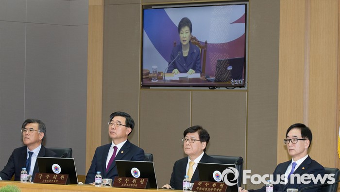 (세종=포커스뉴스) 15일 오전 세종시 정부세종청사 국무회의장에서 열린 청와대-세종청사 국무회의에서 국무위원들이 영상을 통해 박근혜 대통령의 모두발언을 경청하고 있다.