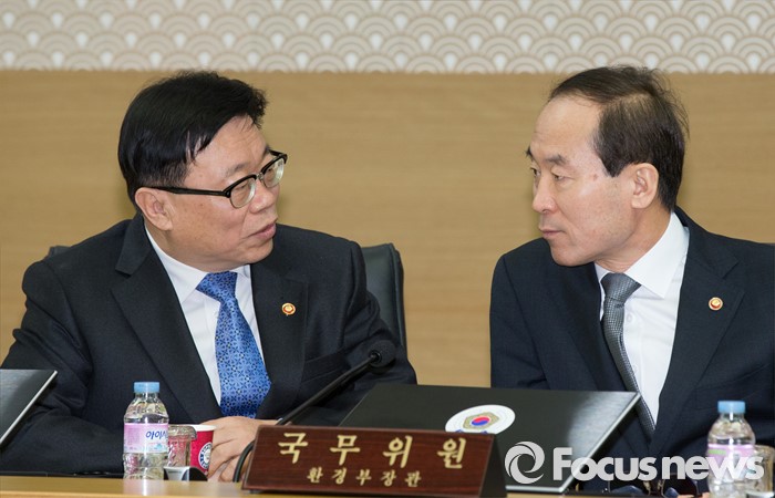 (세종=포커스뉴스) 15일 오전 세종시 정부세종청사 국무회의장에서 열린 청와대-세종청사 국무회의에서 이동필(왼쪽) 농림축산식품부 장관이 윤성규 환경부 장관과 대화하고 있다.