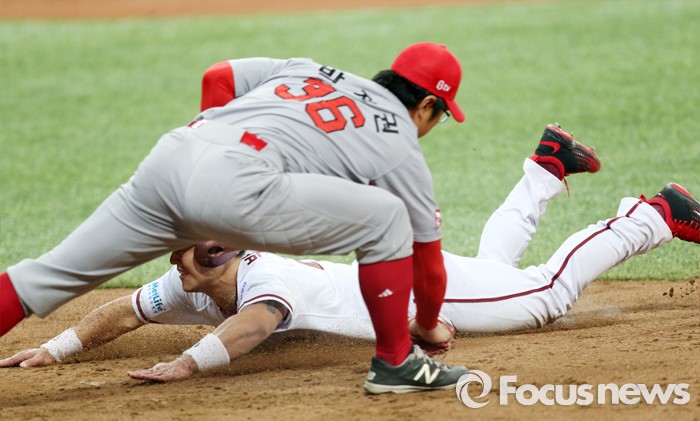 | △ 1루로 귀루하다 아웃되는 박동원 |