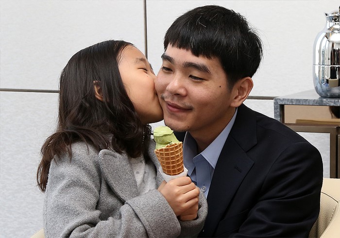 (서울=포커스뉴스) 바둑기사 이세돌(오른쪽) 9단이 15일 오후 서울 광화문 포시즌스호텔에서 열린 구글 딥마인드 챌린지 매치에 참석해 인공지능 바둑프로그램 알파고와의 마지막 대국을 기다리며 딸 혜림양에게 뽀뽀를 받고 있다. <사진제공=구글>