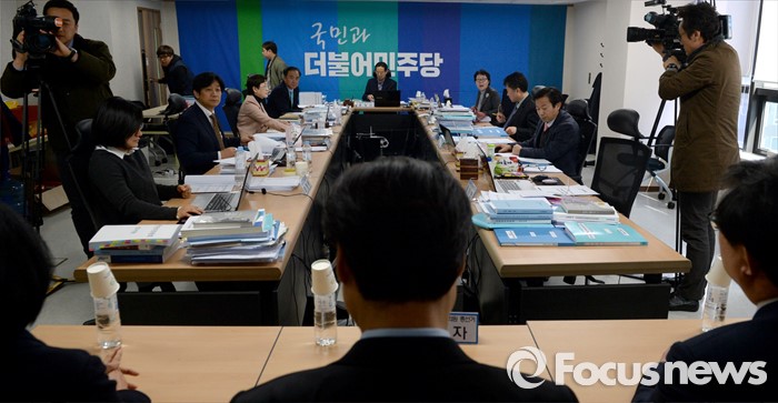 (서울=포커스뉴스) 홍창선 더불어민주당 공천관리위원장을 비롯한 위원들이 15일 오전 서울 여의도 당사에서 20대 총선 비례대표 후보 면접 심사를 하고 있다.
