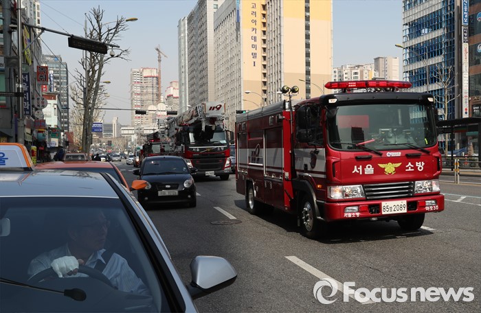 (서울=포커스뉴스) 올해 첫 민방위 훈련이 실시된 15일 오후 서울 마포대로 일대에서 마포소방서 소속 소방차가 길터주기 국민참여 훈련을 하고 있다.