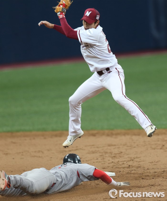(서울=포커스뉴스) 15일 서울 고척스카이돔에서 열린 2016 프로야구 시범경기 SK-넥센 경기 7회 1사 1루에서 SK 1루주자 이명기가고메즈가 삼진당하는 사이 2루 도루에 성공하고 있다.