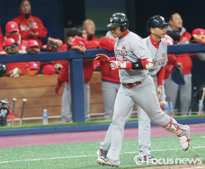 (서울=포커스뉴스) 15일 서울 고척스카이돔에서 열린 2016 프로야구 시범경기 SK-넥센 경기 4회초 2사후 SK 김강민이 우월 만루홈런을 치고 3루코치의 환영을 받으며 홈인하고 있다.