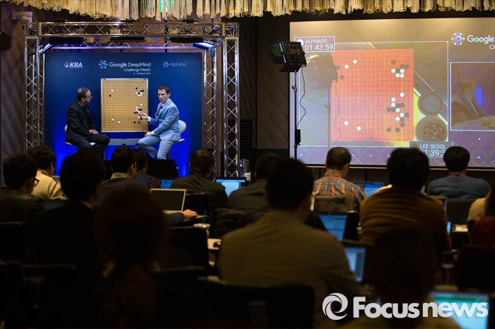 (서울=포커스뉴스) 외국 해설자들이 15일 오후 서울 종로구 포시즌스호텔에서 구글 딥마인드 챌린지 매치, 인공지능 바둑프로그램 알파고와의 다섯번째 대국을 해설하고 있다.