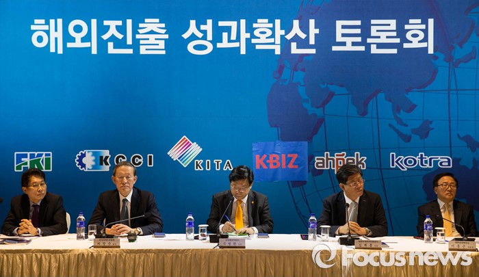(서울=포커스뉴스) 주형환(가운데) 산업통상자원부 장관이 15일 오후 서울 영등포구 전국경제인연합회관에서 열린 '해외진출 성과확산 토론회'에 참석하고 있다. 왼쪽 두번째부터 허창수 전국경제인연합회 회장, 주 장관, 김재홍 대한무역투자진흥공사 사장.