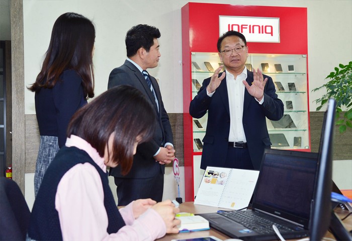 (서울=포커스뉴스) 유일호 부총리 겸 기획재정부 장관이 15일 서울 금천구 가산디지털단지 소재 인피닉(여성우수 중소기업)을 방문해 여성 근로자 근무 환경 시찰을 하고 있다. <사진제공=기획재정부>