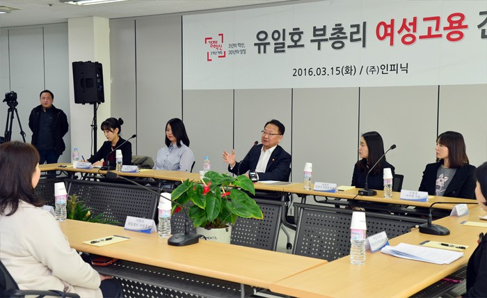(서울=포커스뉴스) 유일호 부총리 겸 기획재정부 장관이 15일 서울 금천구 가산디지털단지 소재 인피닉(여성우수 중소기업)을 방문해 간담회를 갖고 있다. <사진제공=기획재정부>