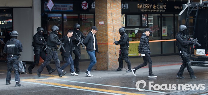 (서울=포커스뉴스) 15일 오후 서울 서초구 고속터미널 광장에서 훈련 참가자들이 시민안전확보를 위한 유관기관 합동 대테러 종합훈련을 하고 있다.