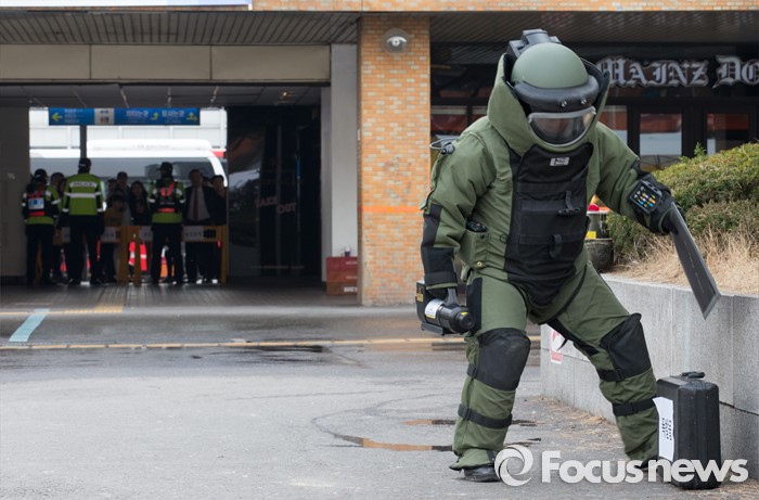 (서울=포커스뉴스) 15일 오후 서울 서초구 고속터미널 광장에서 훈련 참가자들이 시민안전확보를 위한 유관기관 합동 대테러 종합훈련을 하고 있다.