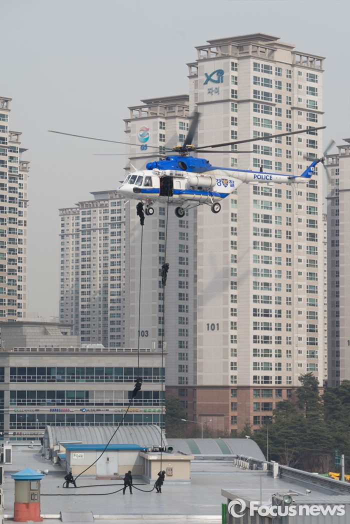 (서울=포커스뉴스) 15일 오후 서울 서초구 고속터미널 광장에서 훈련 참가자들이 시민안전확보를 위한 유관기관 합동 대테러 종합훈련을 하고 있다.
